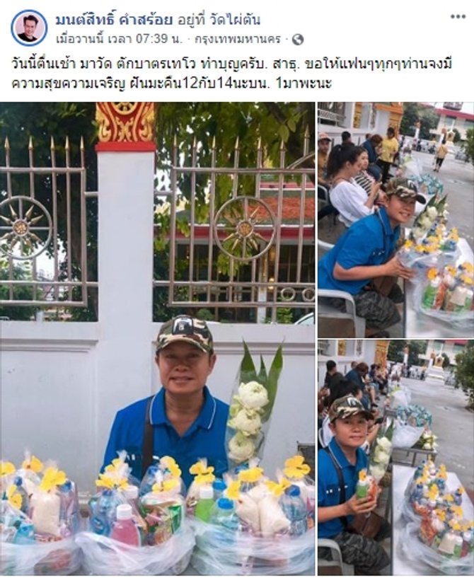 หวยงวด 16 ตุลา  มนต์สิทธิ์ คำสร้อย มาให้เลขอีกเช่นเคยจ้า บอกใบ้เลขเด็ดแบบชัดเจนกันไปเลย กับภาพที่มนต์สิทธิ์มานั่งทำบุญตักบาตร และบอกเลขเด็ดจากความฝันเป็นตัวเลข 12 และ 14 และเน้นที่เลข1 เรียกว่าถูกใจคนที่ชอบเสี่ยงโชคอีกแล้วที่เข้ามาคอมเมนต์ขอบคุณมนต์สิทธิ์กันใหญ่ที่ใจดีแจกเลขเด็กอีกแล้ว