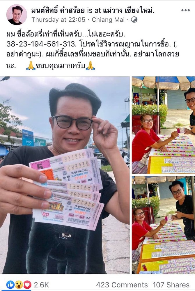 หวยงวดวันที่ 1 ตุลาคม 2562 มาฝากแฟนๆ ที่ชอบเสี่ยงดวงเสี่ยงโชคอย่างต่อเนื่องและสม่ำเสมอไม่ได้ขาด แม้จะบอกถูกบ้าง ไม่ถูกบ้าง แต่นักร้องลูกทุ่งชื่อดัง มนต์สิทธิ์ คำสร้อย ก็ยังคงทำหน้าที่ของตัวเองอย่างต่อเนื่องมาตลอด  เจ้าตัวได้โพสต์รูปตัวเอง กำลังนอนราบกับพื้นและขูดหาตัวเลขที่ต้นไม้ในสวนสาธารณะใจกลางกรุงเทพฯ อย่างตั้งอกตั้งใจ โดยมนต์สิทธิ์โพสต์ว่า “กำลังขูดหาเลขอยู่ครับ งวด 1 ตุลาคมนี้” และหลังจากนั้น เจ้าตัวก็โพสต์ เลขเด็ดประจำงวดที่ 1 ต.ค.ว่า “อยู่กับพี่ รับรองไม่ขาดแคน มีเลขให้ด้วย 738-48-46-24-47 โปรดใช้วิจารณญาณในการชม”